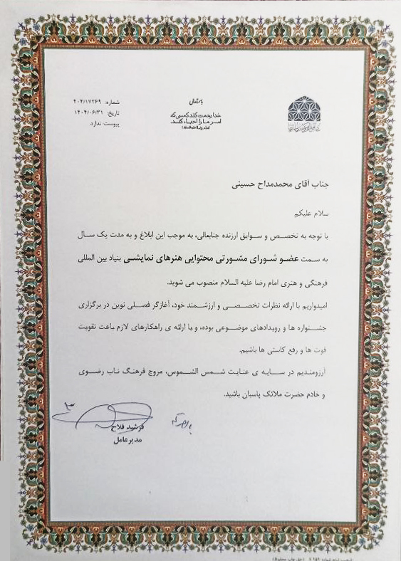 طی حکمی از سوی دکتر فرشید فلاح، مدیرعامل بنیاد بین‌المللی فرهنگی‌ ـ هنری امام رضا(ع)، دکتر سید محمد مداح‌حسینی عضو هیئت علمی و مدیر گروه ادبیات نمایشی مؤسسه آموزش عالی اقبال لاهوری، به‌عنوان عضو شورای مشورتی محتوایی هنرهای نمایشی منصوب شد.